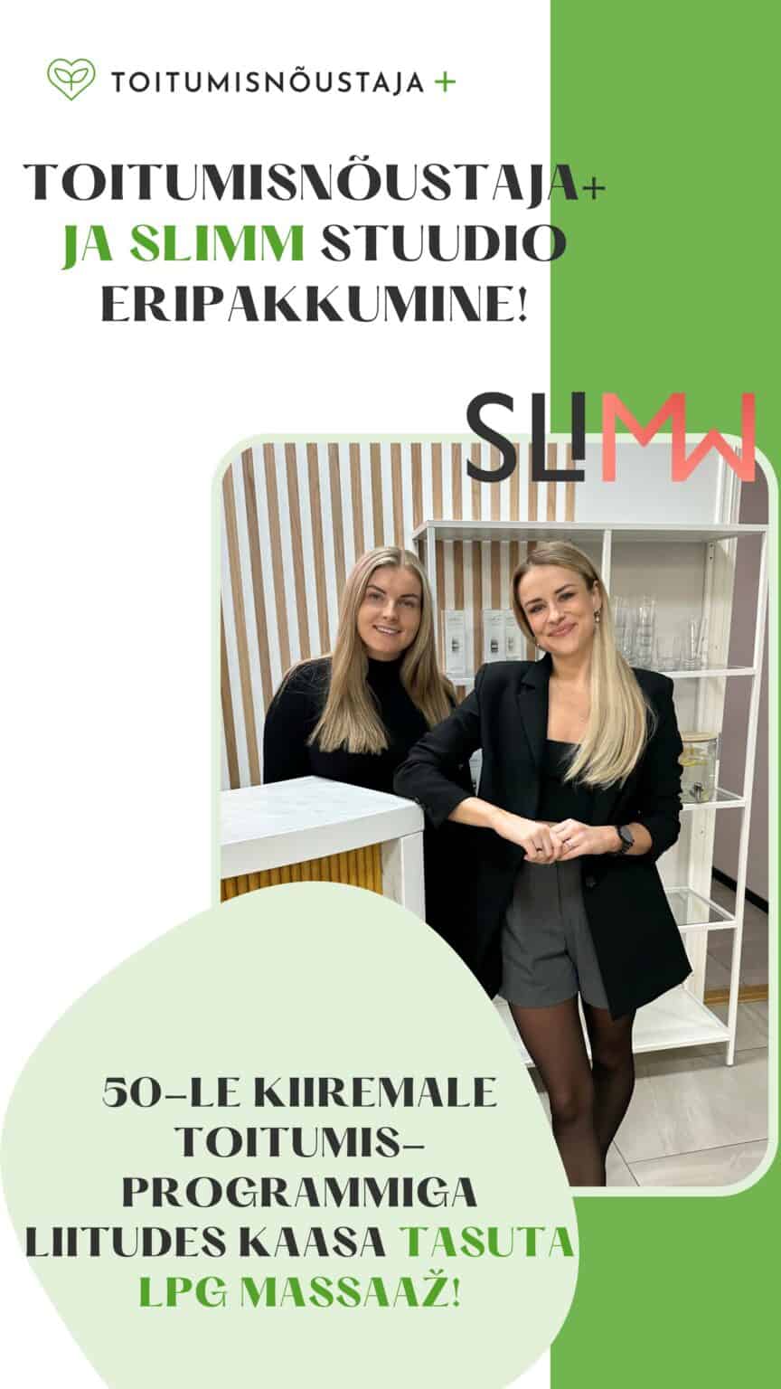 Selle eripakkumise raames saavad 50 kiiremat 3.-5. jaanuaril 8-nädalase Toitumisnõustaja+ toitumisprogrammi põhipaketiga liitudes kingituseks kaasa TASUTA LPG massaaži SLIMM kehastuudios.